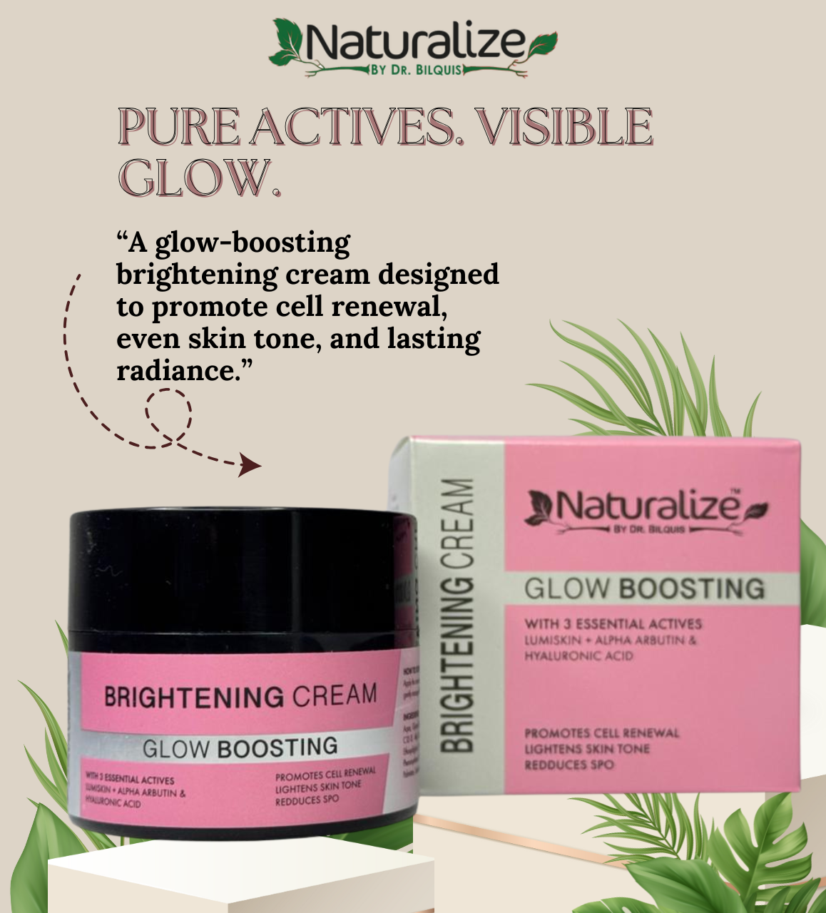 Reveal brighter, smoother, and more radiant skin with Naturalize Glow Boosting Brightening Cream, a carefully formulated skincare solution designed to target uneven skin tone, dark spots, and dullness. Enriched with three powerful essential actives – Lumiskin, Alpha Arbutin, and Hyaluronic Acid, this cream works deep within the skin to promote cell renewal, enhance luminosity, and deliver long-lasting hydration.