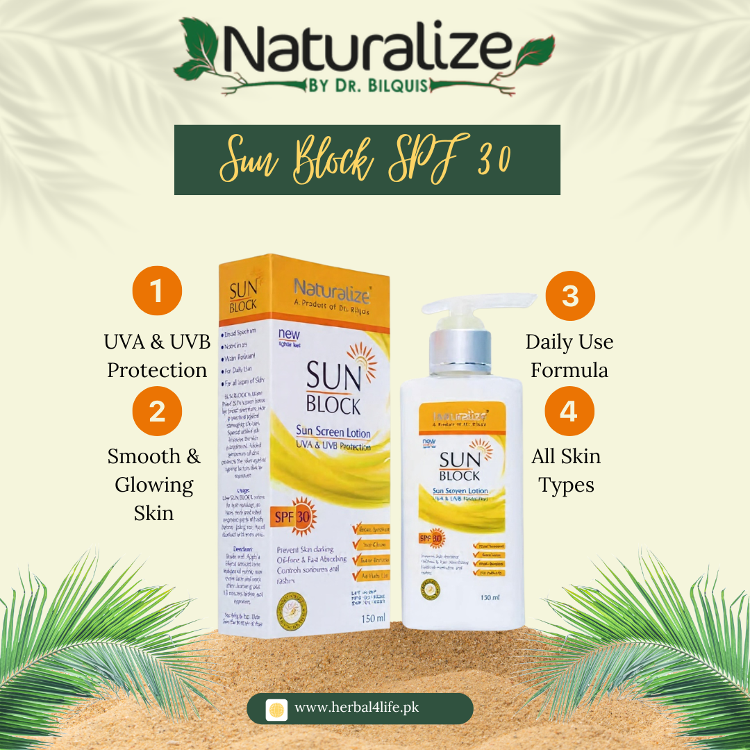 Protect your skin daily with Naturalize Sun Block SPF 30, specially formulated to provide broad spectrum UVA & UVB protection. This sunscreen helps prevent sunburn, tanning, dark spots, freckles and premature aging caused by harmful sunlight.